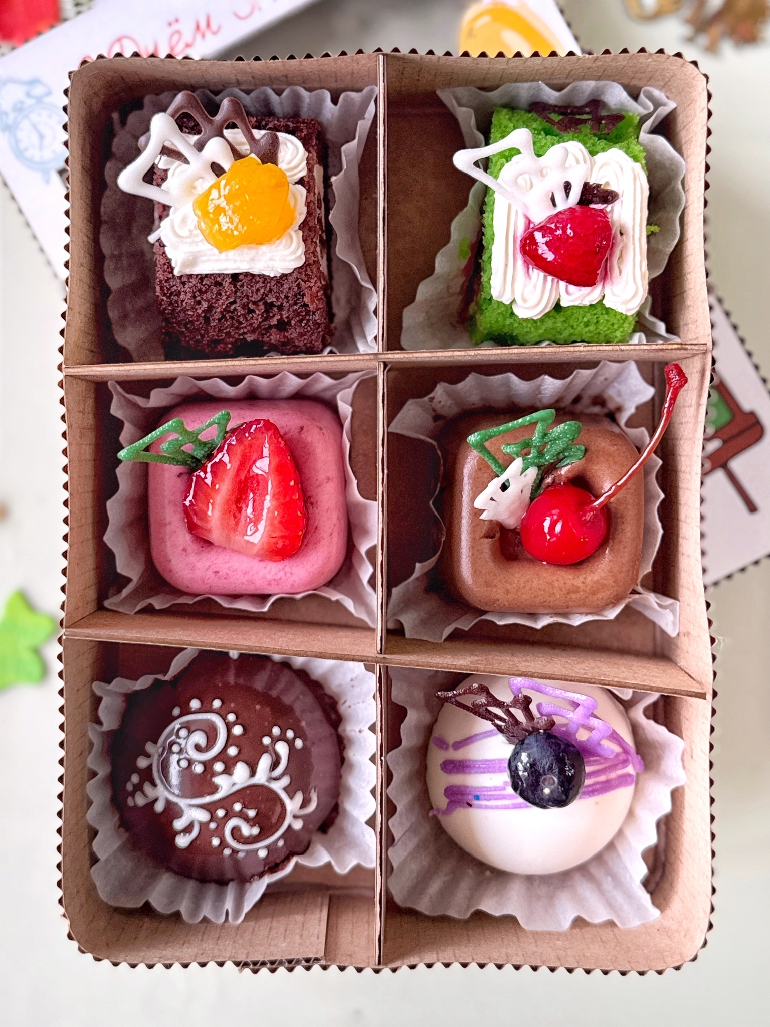 Подарочные наборы из 6 изысканных пирожных: нежные муссы, фруктовые и шоколадные начинки.