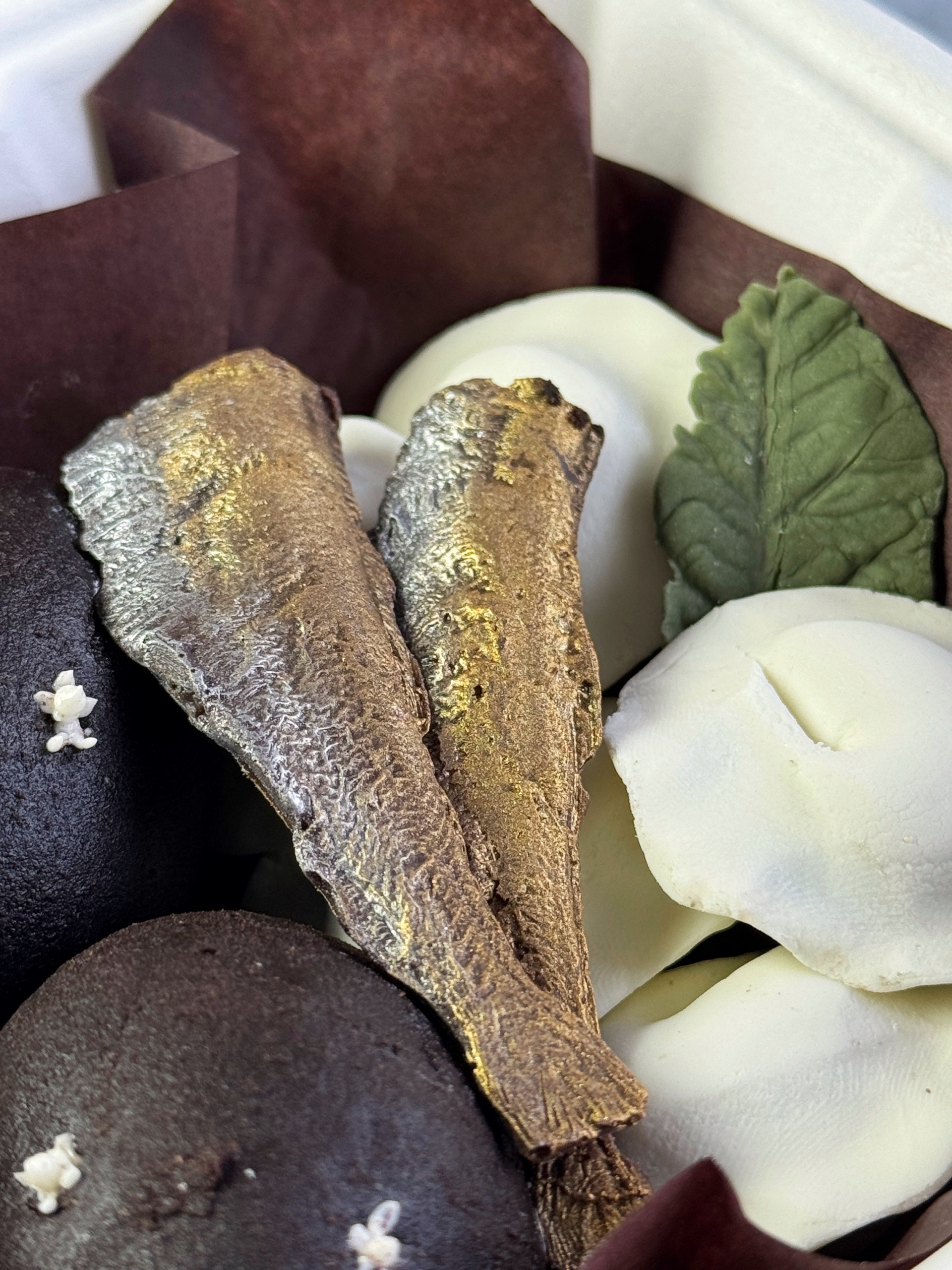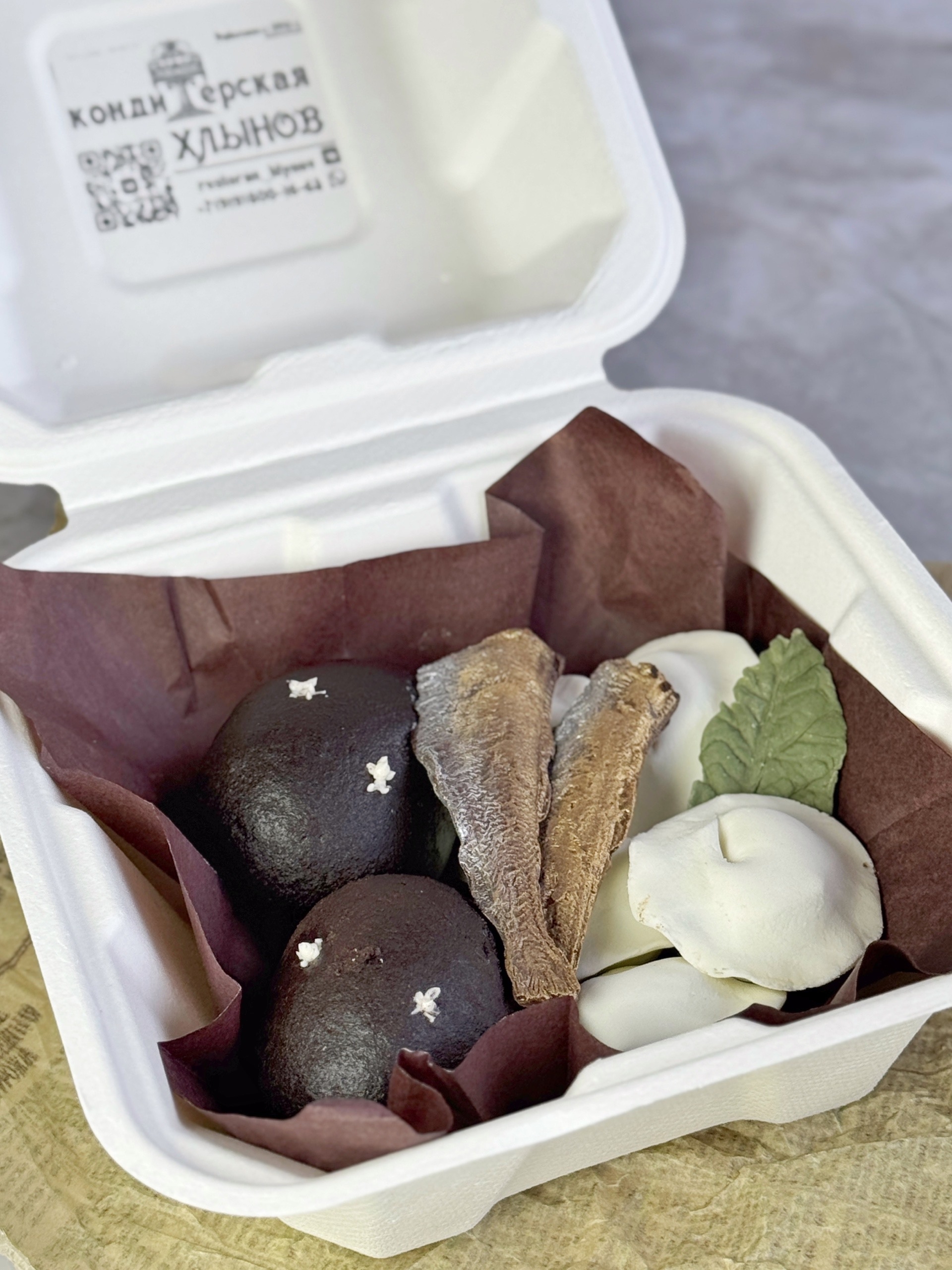В составе классическая «Картошка» и пирожные в мастике в виде пельменей и шоколадная глазурь в форме шпрот.